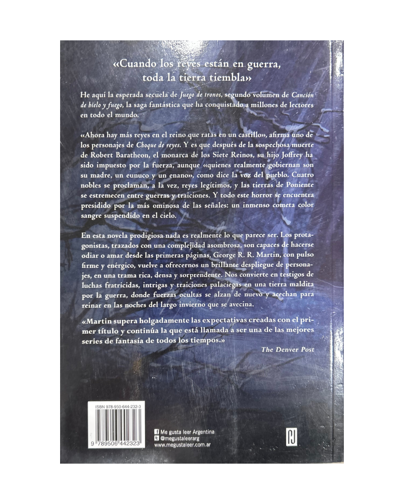 «Cuando los reyes están en guerra, toda la tierra tiembla». En esta esperada secuela de Juego de tronos, segundo volumen de la saga Canción de hielo y fuego, las luchas por el poder se intensifican en los Siete Reinos. Tras la controvertida muerte de Robert Baratheon, su hijo Joffrey es impuesto como rey, aunque el verdadero control recae en su madre, un eunuco y un enano. Mientras tanto, cuatro nobles se proclaman reyes legítimos, sumiendo a Poniente en un torbellino de guerras y traiciones que amenazan con desestabilizar todo el reino.