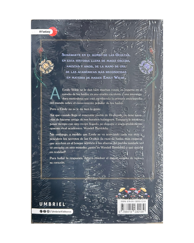 A emily wilde se le dan bien muchas cosas: es experta en el estudio de las hadas: es un herudita excelente y una investigadora meticulosa que está escribiendo la primera enciclopedia del mundo sobre el conocimiento popular de las hadas. Pero a Emily no se le da bien la gente. Así que cuando llega al miserable pueblo de Hrafnvik, no tiene intención de hacerse amiga de sus huraños habitantes. Tampoco le interesa pasar tiempo con otro recién llegado: su elegante e insoportablemente apuesto rival académico. Wendell Bambleby. Sin embargo, a medida que Emily se va acercando cada vez más a descubrir los secretos de las Ocultas (la raza de hadas más esquiva) que acechan en el bosque sombrío a las afueras del pueblo, también se ve envuelta en otro misterio: ¿Quién es Wendell Bambleby y qué quiere en realidad? Para hallar la respuesta, deberá resolver el mayor enigma de todos, su corazón.