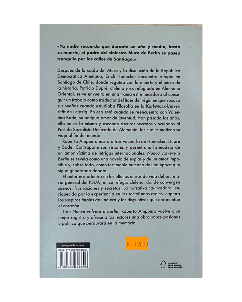 Esta novela sigue a un escritor chileno que regresa a Berlín después de muchos años para confrontar su pasado. A través de una trama que mezcla espionaje, historia personal y política, la novela explora la memoria, la identidad y las huellas de la Guerra Fría. Ampuero narra tres voces: la de Honecker. Dupré y Bode. Contrapone sus visiones y desentraña la madeja de un amor victima de intrigas internacionales.