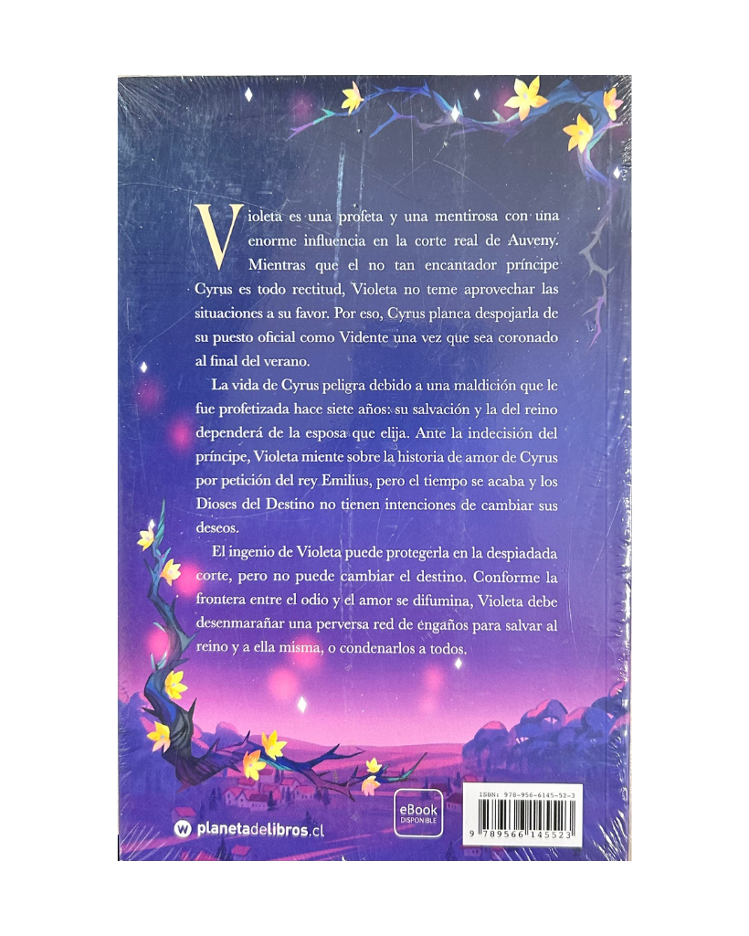 Violeta es una profeta y una mentirosa con una enorme influencia en la corte real de Auveny. Mientras que el no tan encantador príncipe Cyrus es todo rectitud, Violeta no teme aprovechar las situaciones a su favor. Por eso, Cyrus planea despojarla de su puesto oficial como Vidente una vez que sea coronado al final del verano. La vida de Cyrus peligra debido a una maldición que le fue profetizada hace siete años: su salvación y la del reino dependerá de la esposa que elija. Ante la indecisión del príncipe, Violeta miente sobre la historia de amor de Cyrus por petición del rey Emilius, pero el tiempo se acaba y los Dioses del Destino no tienen intenciones de cambiar sus deseos. El ingenio de Violeta puede protegerla en la despiadada corte, pero no puede cambiar el destino. Conforme la frontera entre el odio y el amor se difumina, Violeta debe desenmarañar una perversa red de engaños para salvar al reino y a ella misma, o condenarlos a todos.